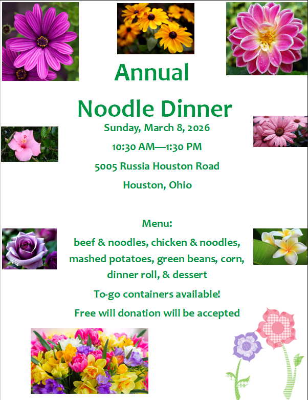 Our Chicken & Noodle and Beef & Noodle Dinner is usually the second Sunday in March from 10:30AM to 1:30PM. Next year it will be Sunday, March 8, 2026. Our menu generally includes chicken & noodles, beef & noodles, mashed potatoes, gravy, green beans, corn, dinner roll, dessert, punch, and coffee. Free-will donations are accepted. To-go containers are available as well. Everyone is welcome! Houston High School students who volunteer can become eligible for our scholarship! Sign up here.